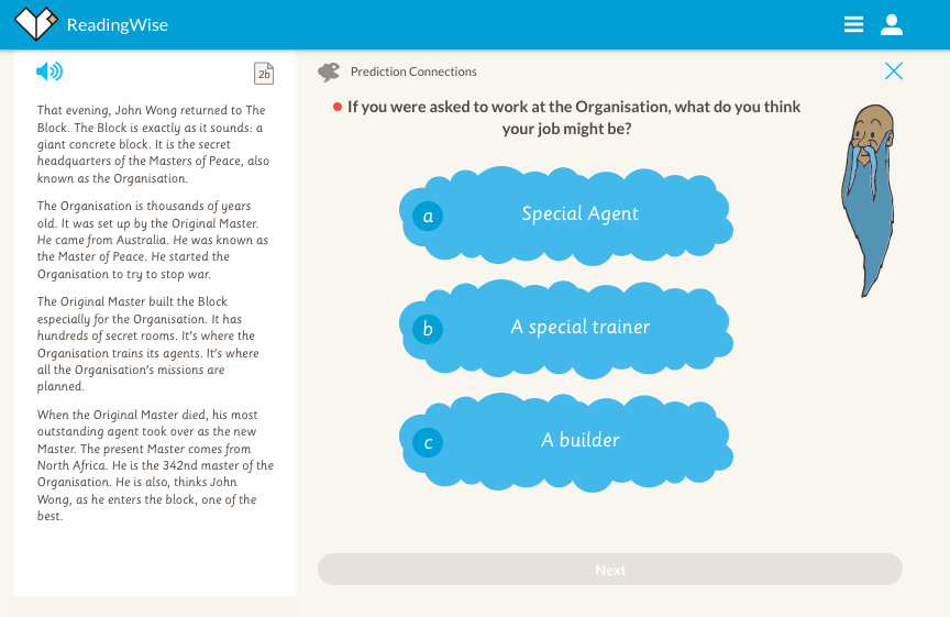 The following image is an extract from The Red Stone of Calcutta. Learners would work through a series of questions and select from suggested answers. Guidance and purpose is provided via The Master, the aim is for learners to then be able to apply the prediction connections process whenever they encounter a text. In later episodes, once they are trained, learners are free to select this mini-skill from their bank of 12.