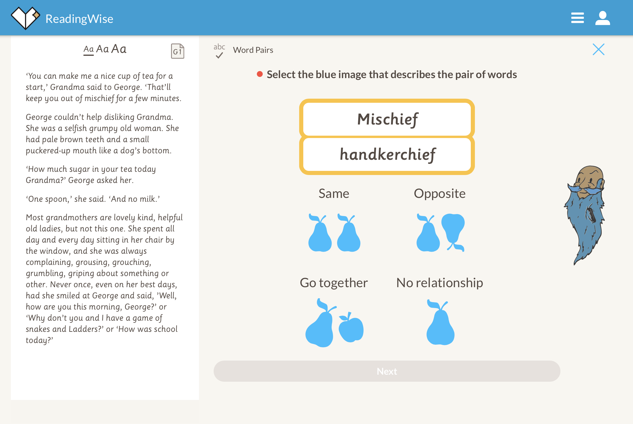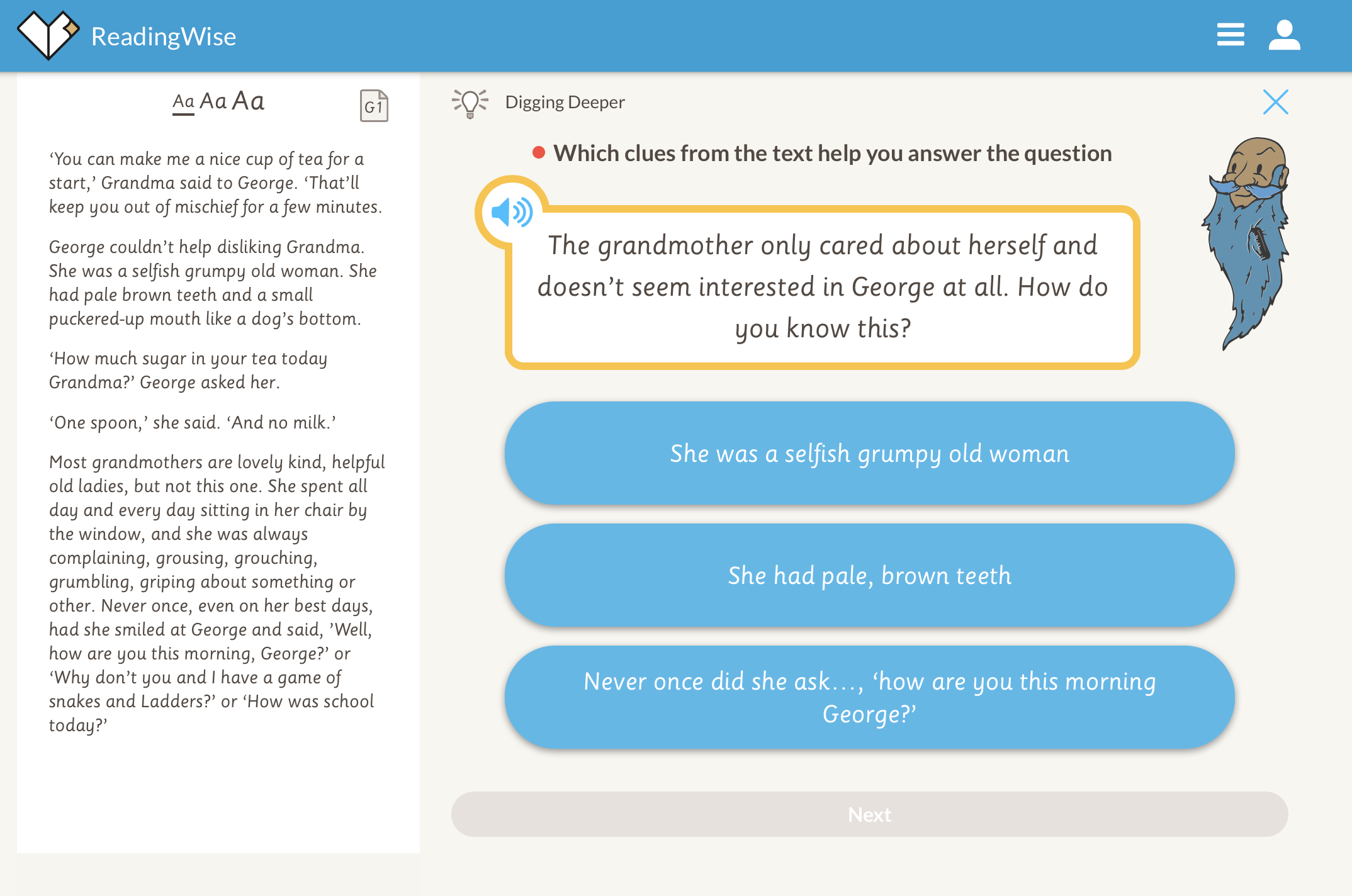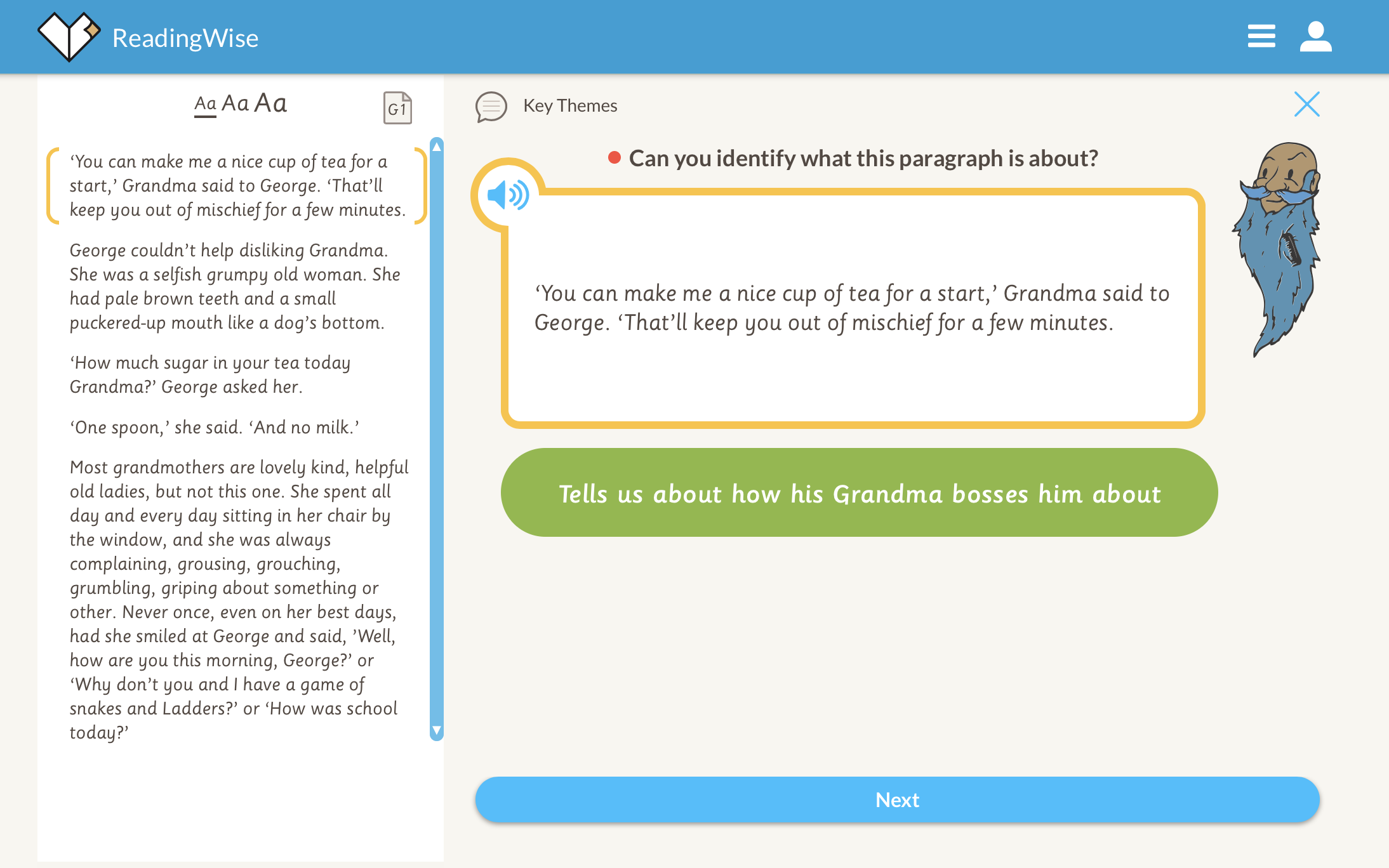 4. Discuss. Now for 'Discuss'. This activity is all about raising your own questions. Why does Grandma think George is up to mischief? What would you discuss? https://app.readingwise.com/super/toolkits/210
