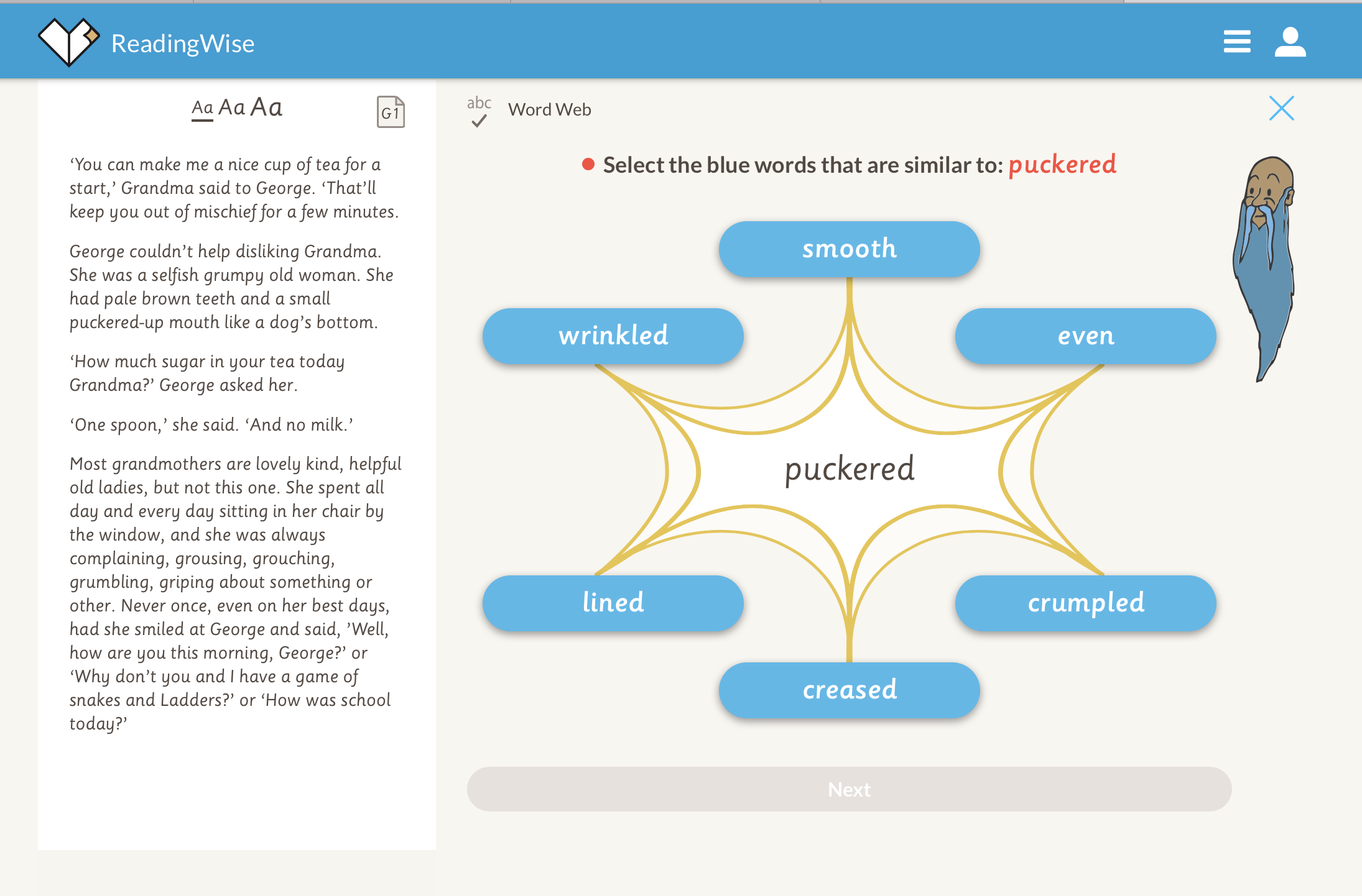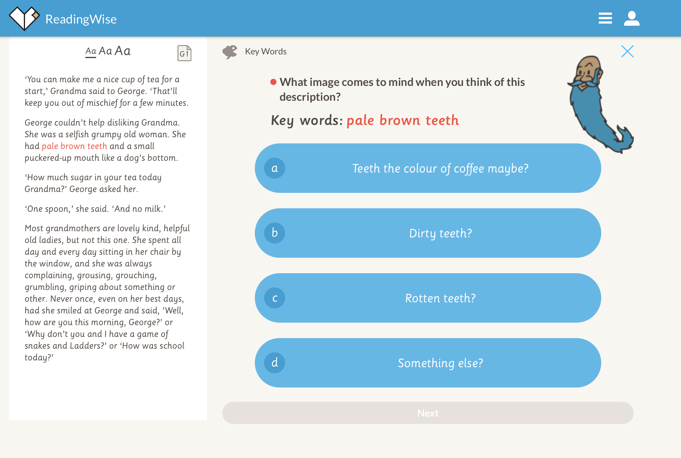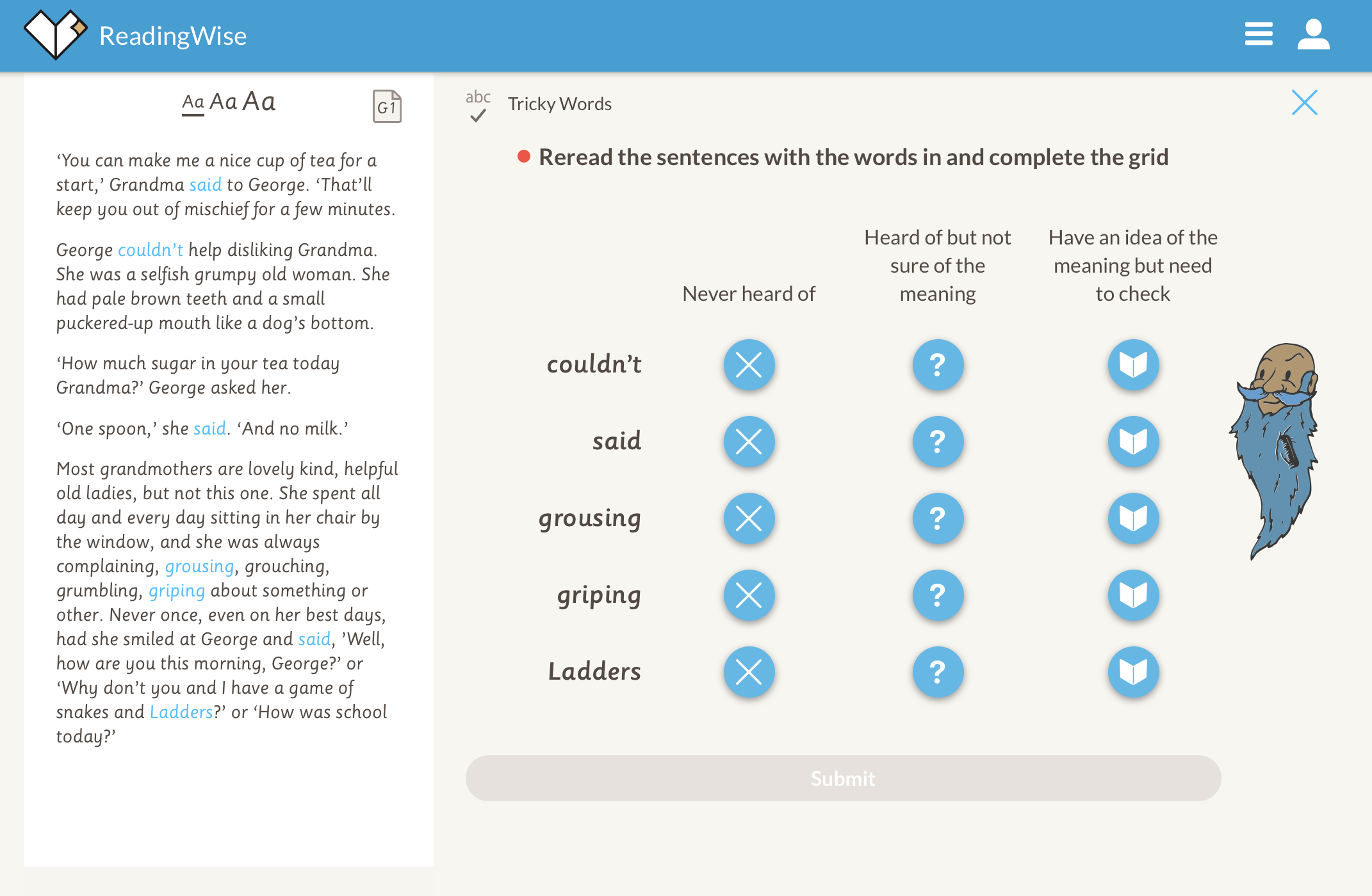 4. Discuss. Now for 'Discuss'. This activity is all about raising your own questions. Why does Grandma think George is up to mischief? What would you discuss? https://app.readingwise.com/super/toolkits/210