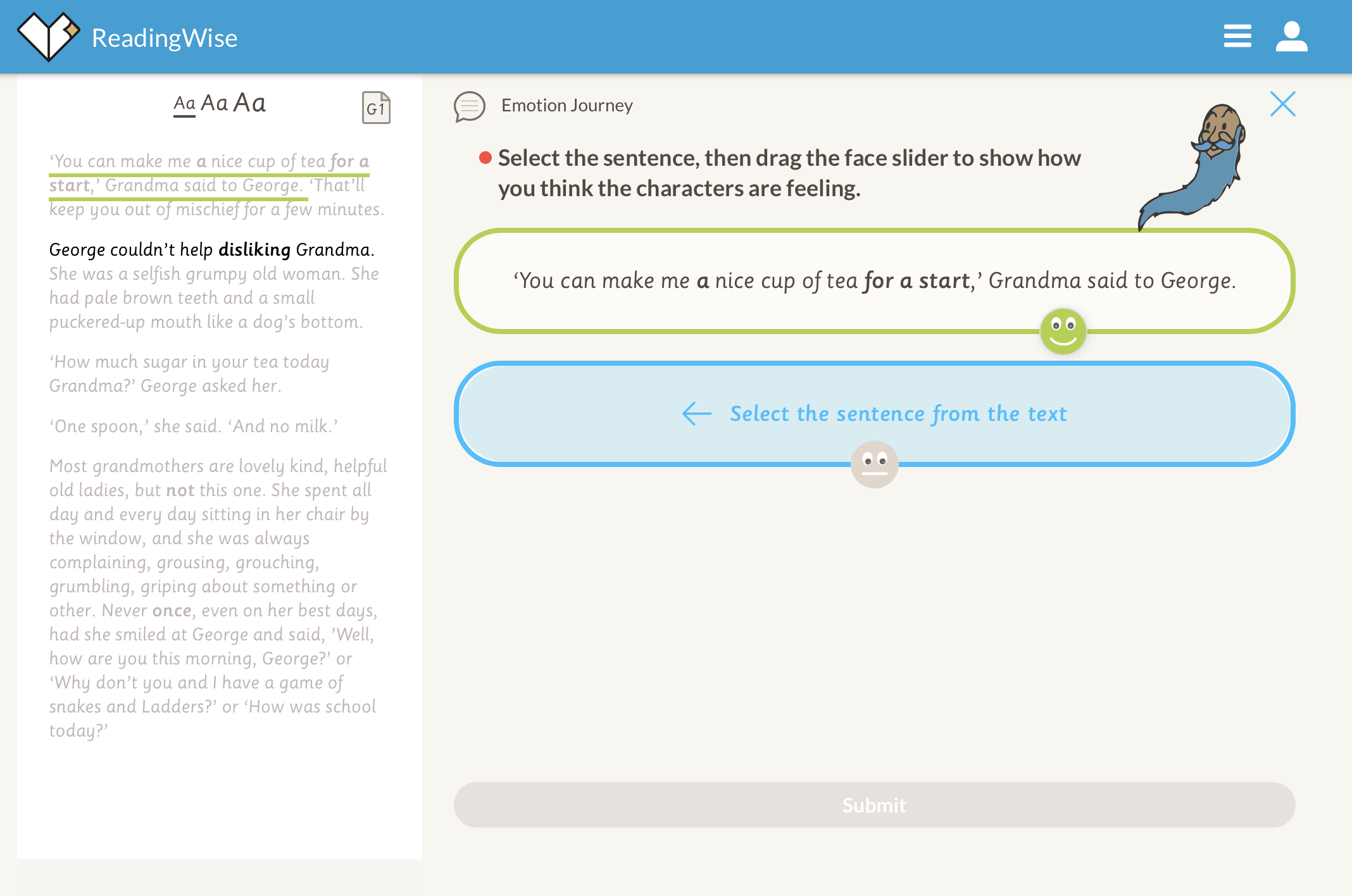 2. Emotion Journey Go to 'Emotion Journey' through this link: https://app.readingwise.com/super/toolkits/214. Read the highlighted passage and decide how the character is feeling, or what the mood of the story is at this point. Track the emotions and feelings!