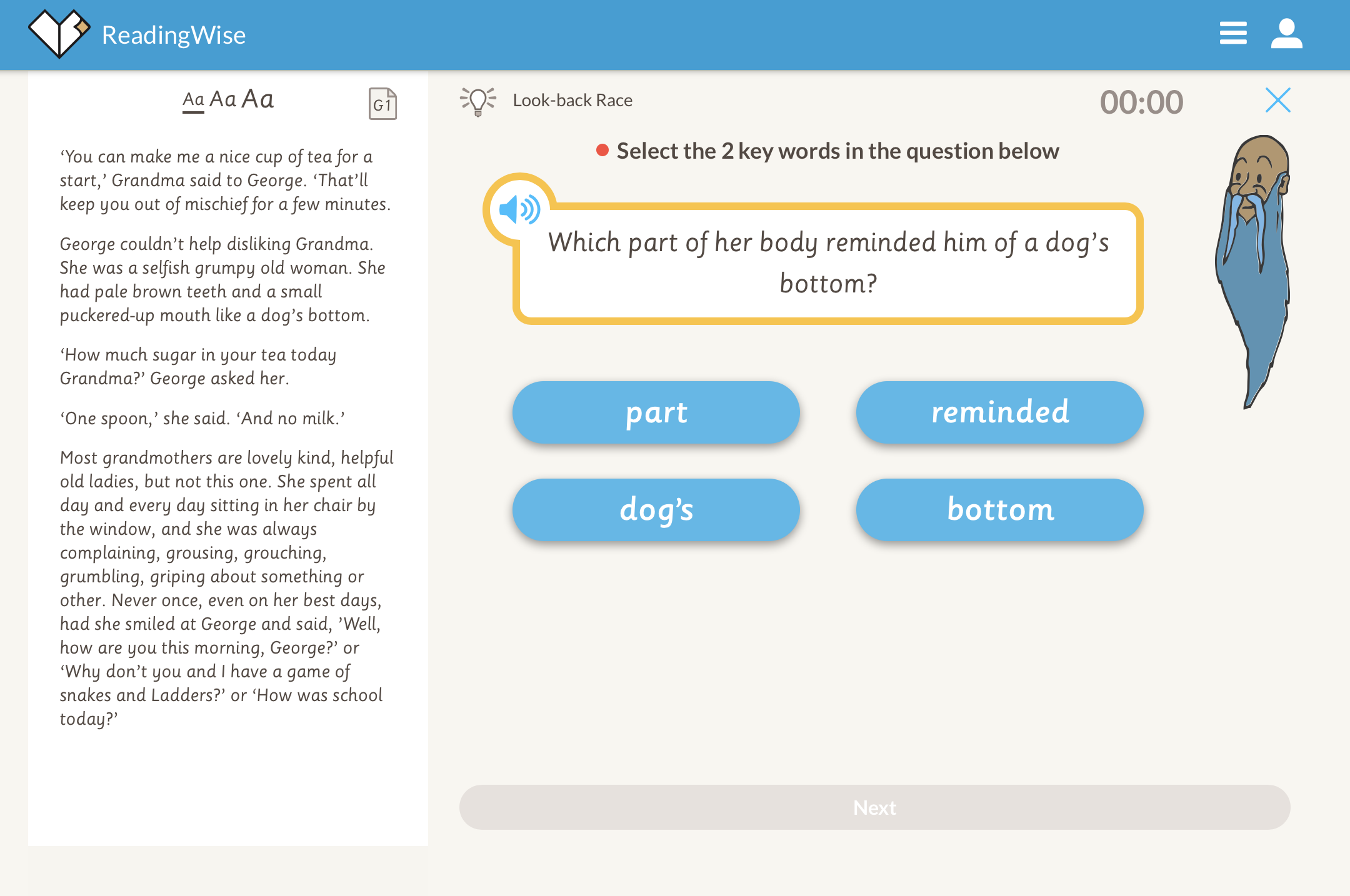 2. Look-back Race Go to 'Look-back Race' through this link: https://app.readingwise.com/super/toolkits/208. Select the key words in the questions. Then, using the key words, find the answer in the extract. This activity helps you to scan and identify key pieces of information. It's retrieval practice - literal questions are literally right there!