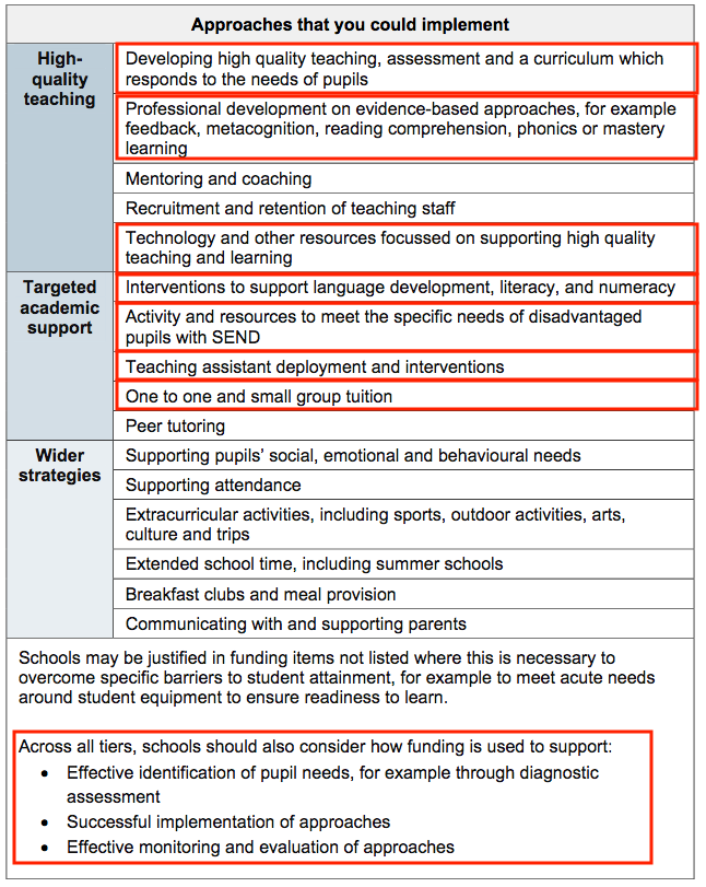 The menu of approaches (image below) is on page 7 of this government-issued 'Using pupil premium: guidance for school leaders' document. ReadingWise aligns with the highlighted areas on the menu as per below.