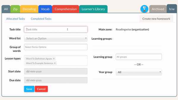 Vocab Task Mode: You are able to set tasks (think homework) for pupils. These tasks can be allocated a due date. Many schools use this to help organise the programme to compliment their curriculum and to use the programme to harmonise and reinforce the teaching and learning happening in the classroom.