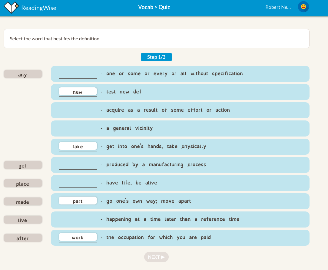 Teachers provide context in class and the ReadingWise Vocab programme embeds the words in learners' long-term memories. This includes a revision cycle once the word is mastered.