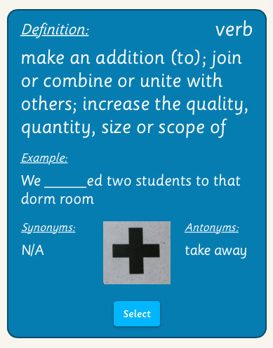 In Basic Flow Mode, Vocab carefully de-scaffolds each word. In the first exposure, learners are provided with images, definitions, synonyms, antonyms, word types, and example sentences. As their security increases, the system 'de-scaffolds' ⏤ so at the second interaction (assuming they got it right the first time), they no longer have the images.