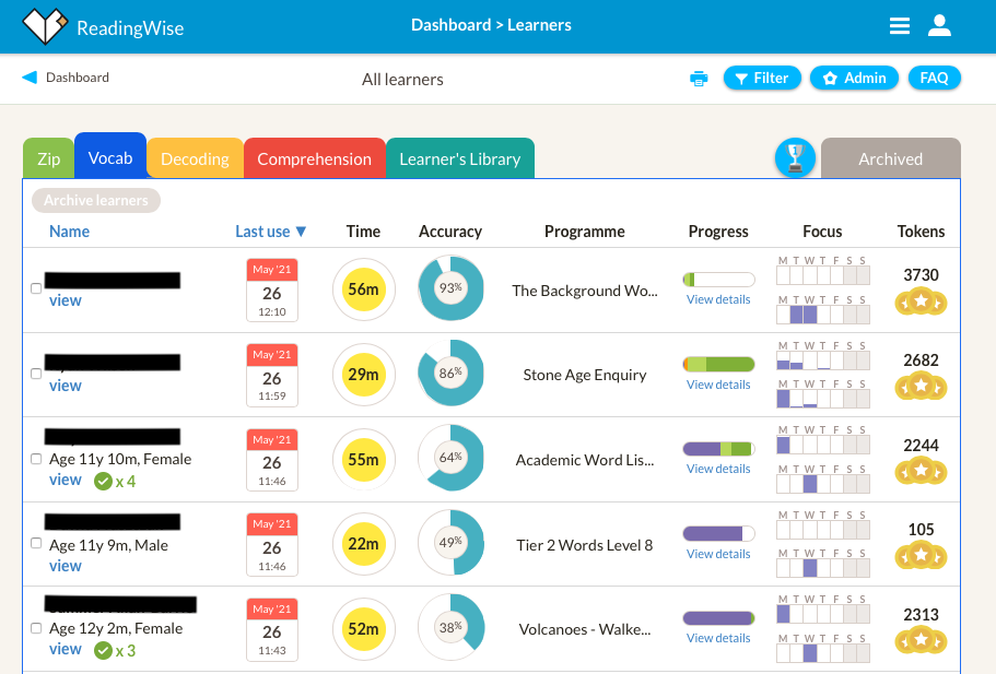 We recommend learners interact with the programme for 5-10 minutes, several times a week. This allows spaced learning and repetition to happen and is easy to deliver ⏤ either at school, at home, or ideally both. Pupils can login at home because every ReadingWise module that a school subscribes to comes with individual logins for students and staff.